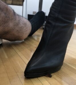 片足で小さな人に軽く足を乗せ、もう片足で股間をしごく。